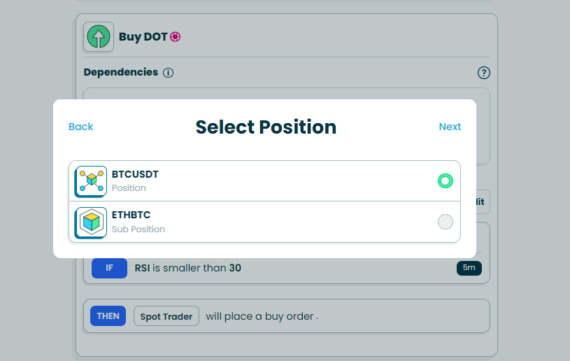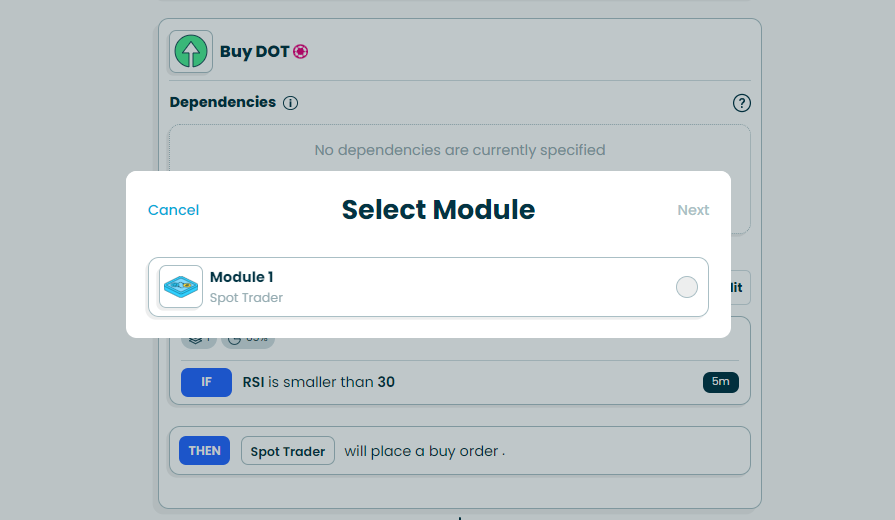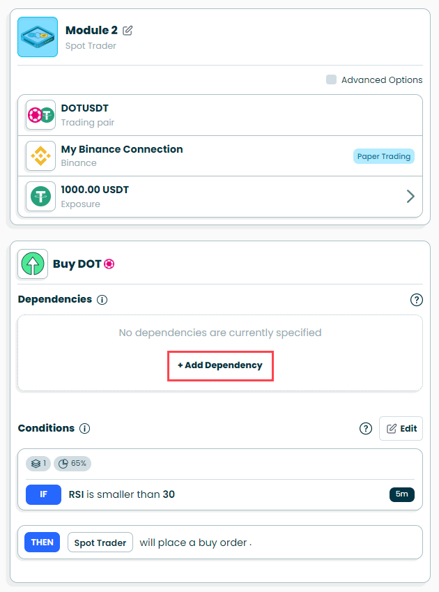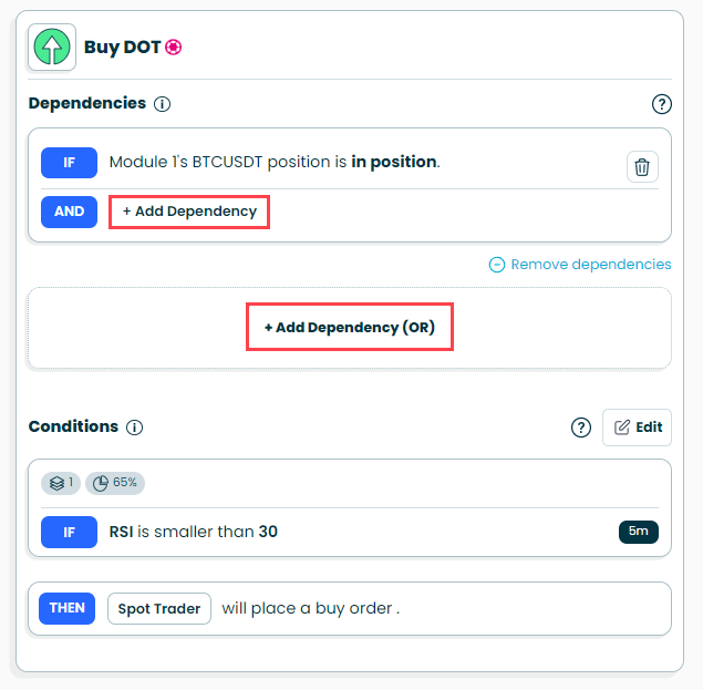 Dependencies can be added to both the Buy and Sell components of your module. This means that if you add a dependency to the Buy side, your module can only buy if the dependency is fulfilled and your buy conditions are met. Conversely, if you add a dependency to the sell side, your module will only sell if the dependency is fulfilled and sell conditions are met.
