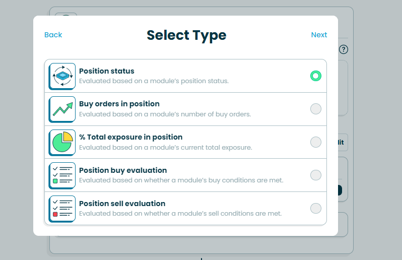 * **Position buy evaluation:** Evaluated based on whether a module’s buy conditions are met.