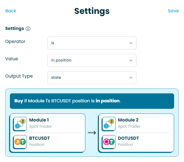 A dependency is a rule relating to the state or actions taken by another module. For example, imagine you are creating a strategy using Bitcoin as a general indicator for the rest of the crypto market. There are multiple ways to go about this. You could create a module that trades Bitcoin and then create one or more linked modules trading altcoin pairs with the dependency they may buy when the Bitcoin module is in position.